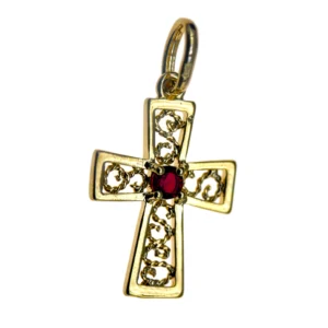 Croix ajourée en plaqué or avec pierre centrale – Rouge ou Bleue – 18 mm