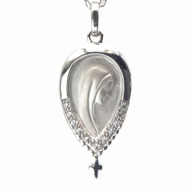 Pendentif Vierge Marie en forme de goutte – Argent 925 et zircons (blancs ou roses)
