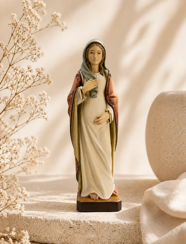 Statue Vierge Marie enceinte – bois sculpté peint – Fabrication italienne Val Gardena