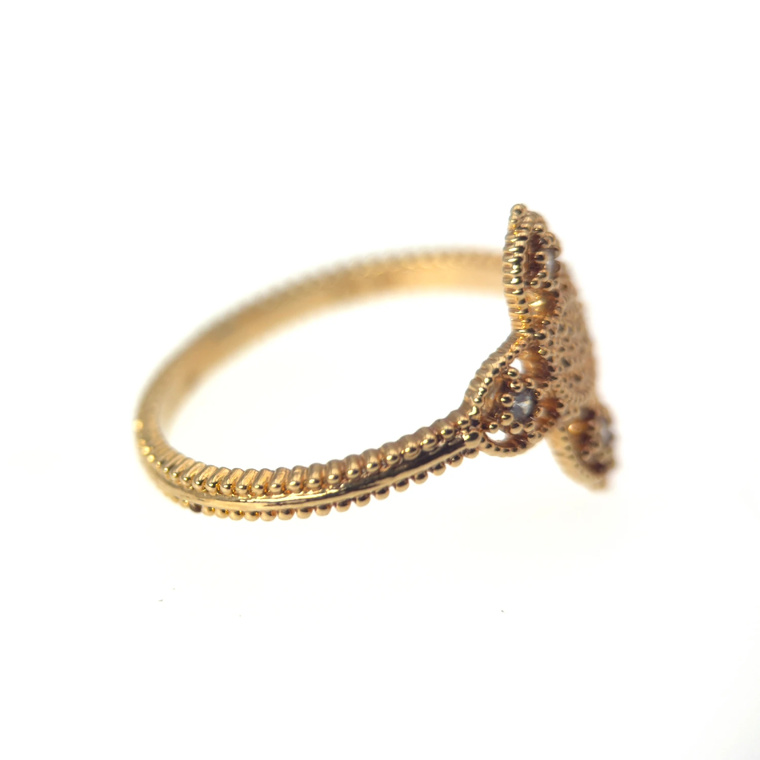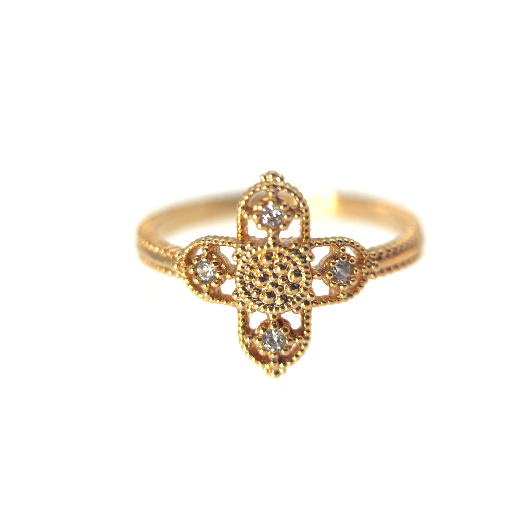 Cette bague en plaqué or 18 carats arbore une délicate croix ajourée, entièrement travaillée dans un style fin et ornemental. Ses contours perlés dévoilent un artisanat minutieux, rappelant les motifs anciens des bijoux religieux traditionnels. Aux quatre extrémités de la croix, de petits strass étincelants apportent une touche lumineuse et féminine, renforçant la beauté du symbole.
