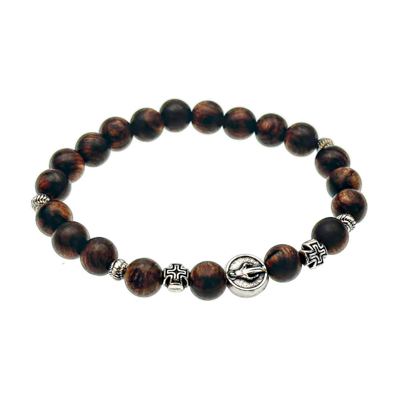 Les perles de bois lisse sont entrecoupées de croix argentées finement gravées et d’une médaille mariale, symboles de foi et de bénédiction.