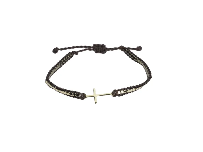 Bracelet cordon brun & perles métalliques – croix dorée – Leo & Geo