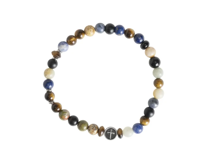 Ce bracelet spirituel Leo & Geo se distingue par ses perles naturelles multicolores associées à une croix centrale en métal. Chaque perle unique reflète la beauté de la création et l’universalité de la foi.