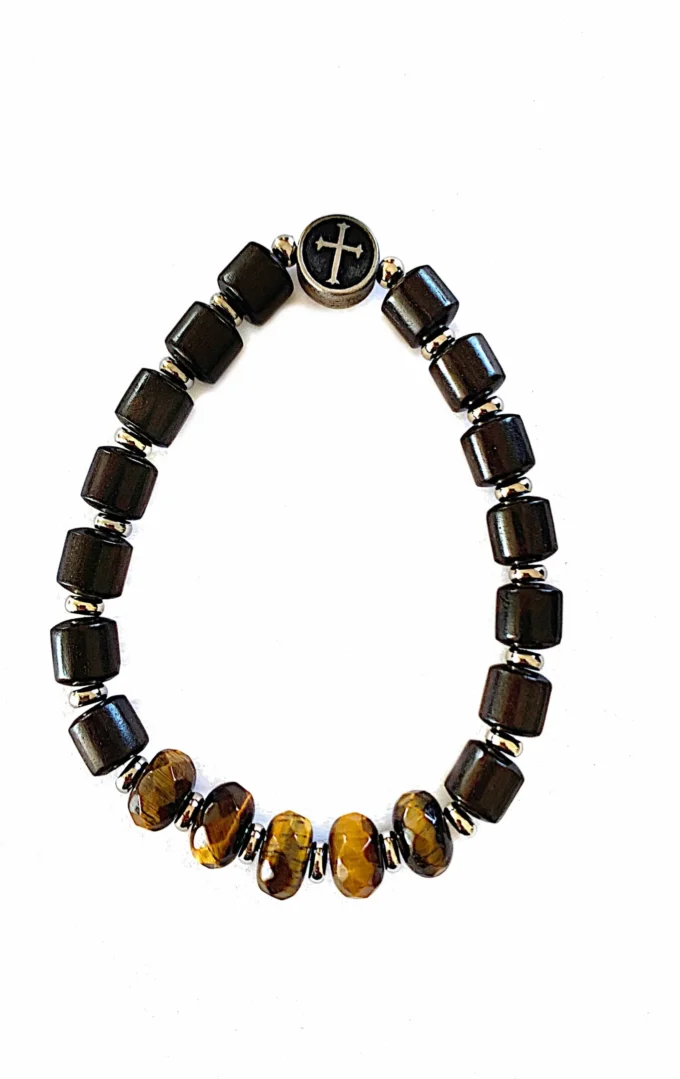 Ce bracelet Leo & Geo associe perles noires raffinées et perles dorées scintillantes, sublimées par une croix centrale en métal. Élégant et intemporel, il incarne force, foi et modernité.