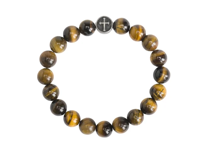 Ce bracelet spirituel Leo & Geo est composé de superbes perles naturelles en Œil de Tigre, pierre de protection et de force intérieure. Il est sublimé par une croix métallique qui rappelle la foi chrétienne.