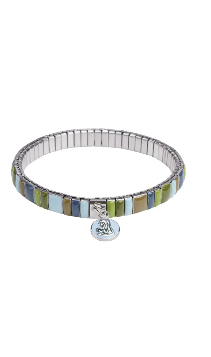 Modernité et spiritualité par Leo & Geo. Maillons céramiques émaillés dans des tons bleu, vert et sable montés sur un bracelet extensible en acier. Charm rond gravé de la Vierge, symbole protecteur et réconfortant. Extensible, confortable et mixte, parfait au quotidien seul ou empilé. Une pièce tendance qui relie style et foi.