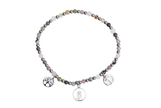 Bracelet perles multicolores – Charms argentés : croix, Vierge Marie & arbre de vie