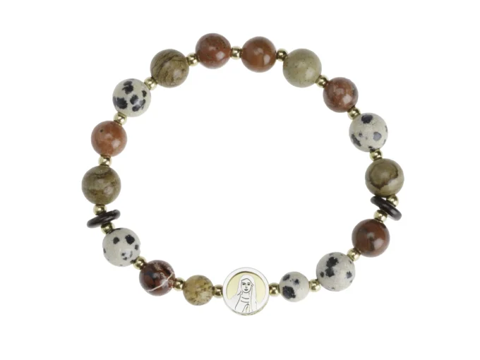 Caractère et dévotion par Leo & Geo. Perles naturelles aux motifs dalmatiens mêlées à des tons bruns et sable, séparées par petites billes dorées. Une médaille centrale de la Vierge illumine le poignet et protège au quotidien. Bracelet élastique, mixte et intemporel ; se porte seul ou en accumulation. Un cadeau symbolique qui touche le cœur.