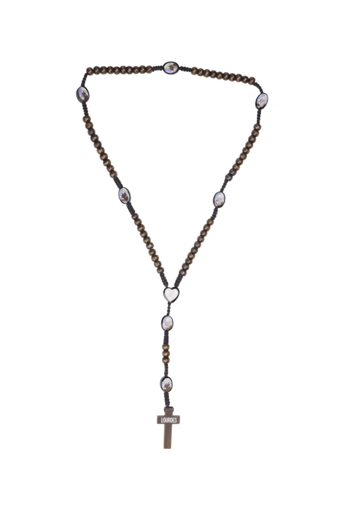 Chapelet en bois lisse orné de médaillons ovales de Lourdes qui rythment la méditation.