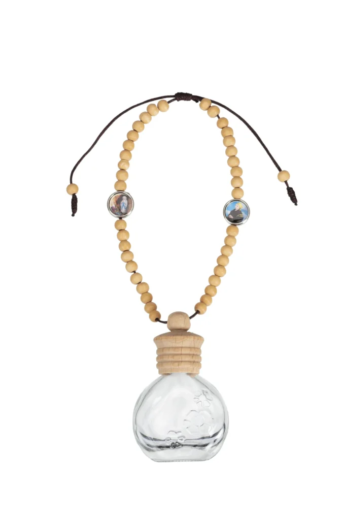 Souvenir à emporter, prière à partager. Un petit chapelet orné d’une fiole en verre et de médaillons marials.
