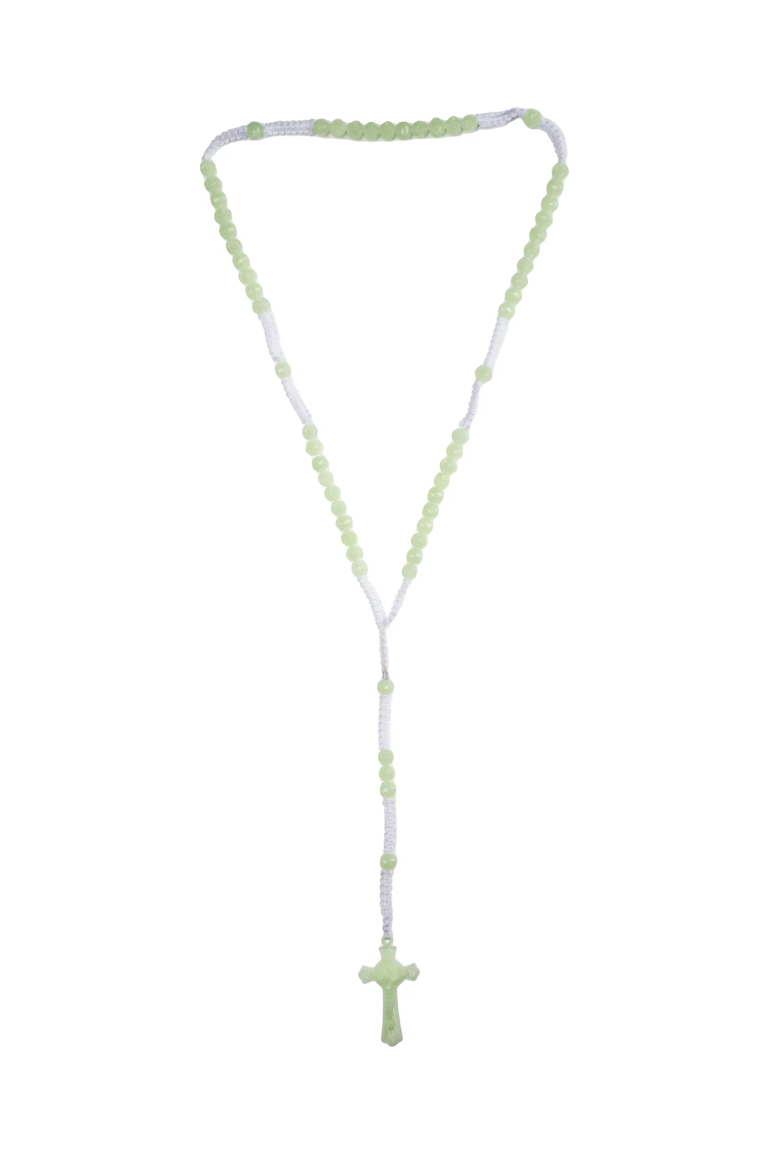 Chapelet aux perles phosphorescentes vert tendre qui brillent dans l’obscurité, rappelant la lumière de l’espérance.