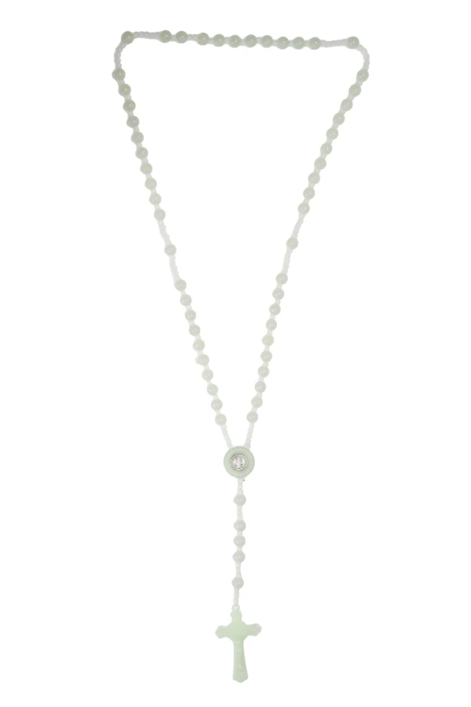 Chapelet aux perles phosphorescentes vert pâle : il capte la lumière le jour et l’émet dans l’obscurité pour veiller à la prière du soir.