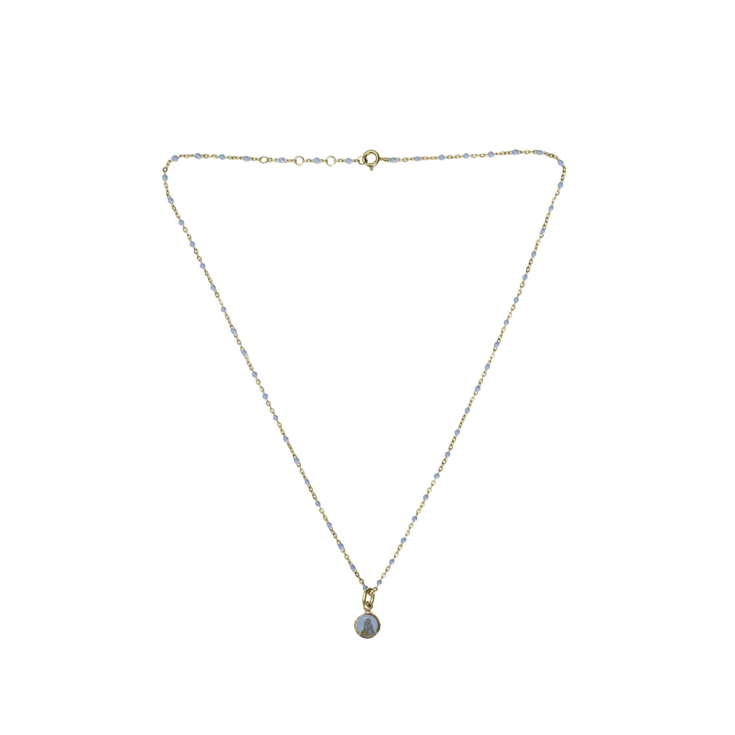 Ce collier doré au style fin et spirituel présente une médaille mariale suspendue à une chaîne ornée de petites perles bleues. Le bleu, couleur de la Vierge, évoque la paix, la fidélité et la protection. Fabriqué en acier inoxydable, ce bijou lumineux accompagne la foi avec délicatesse et élégance.