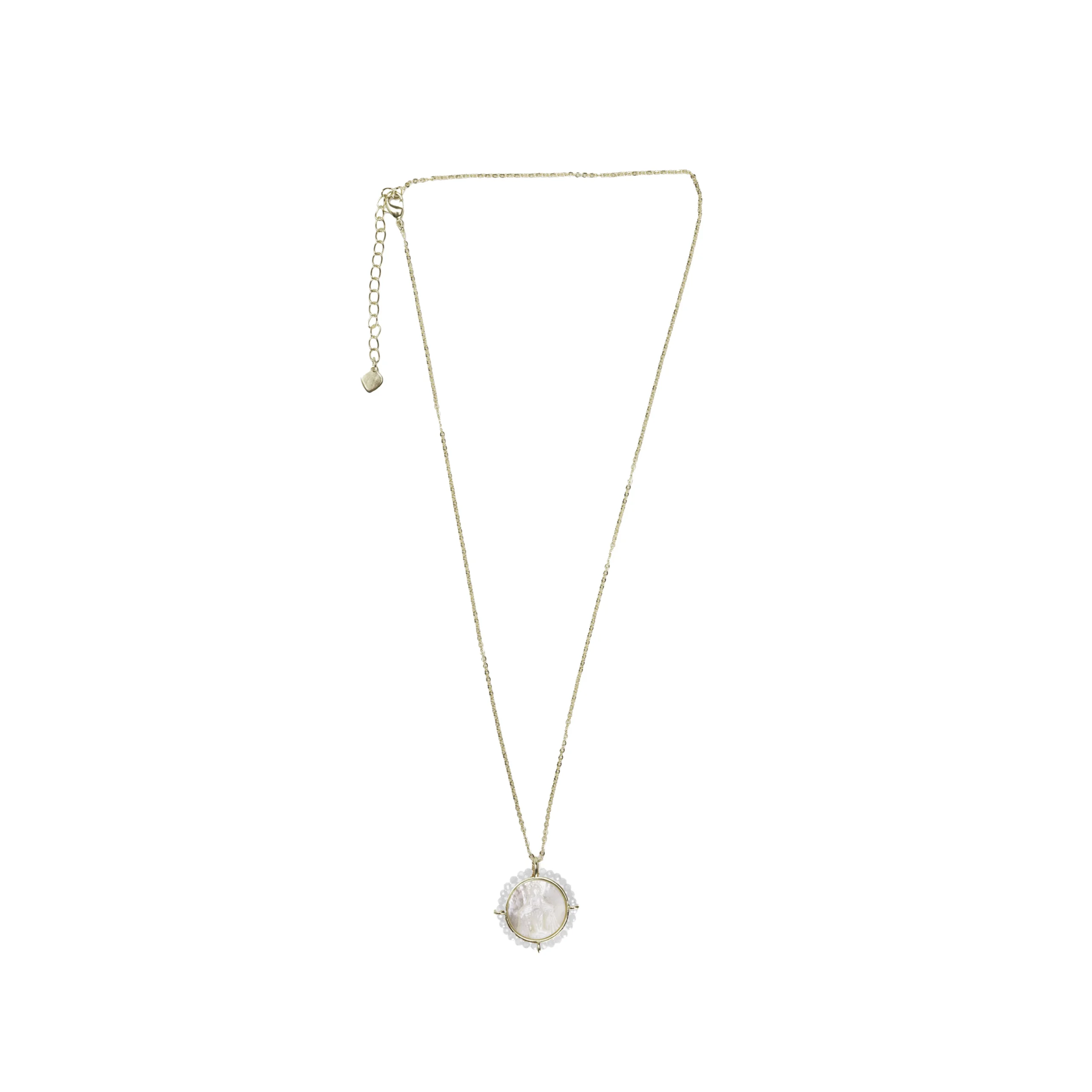 Ce collier doré présente une médaille ronde de la Vierge Marie, entourée de perles blanches symbolisant la pureté et la lumière divine. Chaque perle reflète une prière silencieuse, un éclat d’espérance. Fabriqué en acier inoxydable, il résiste au temps et garde son éclat, tel un signe de foi à porter chaque jour.