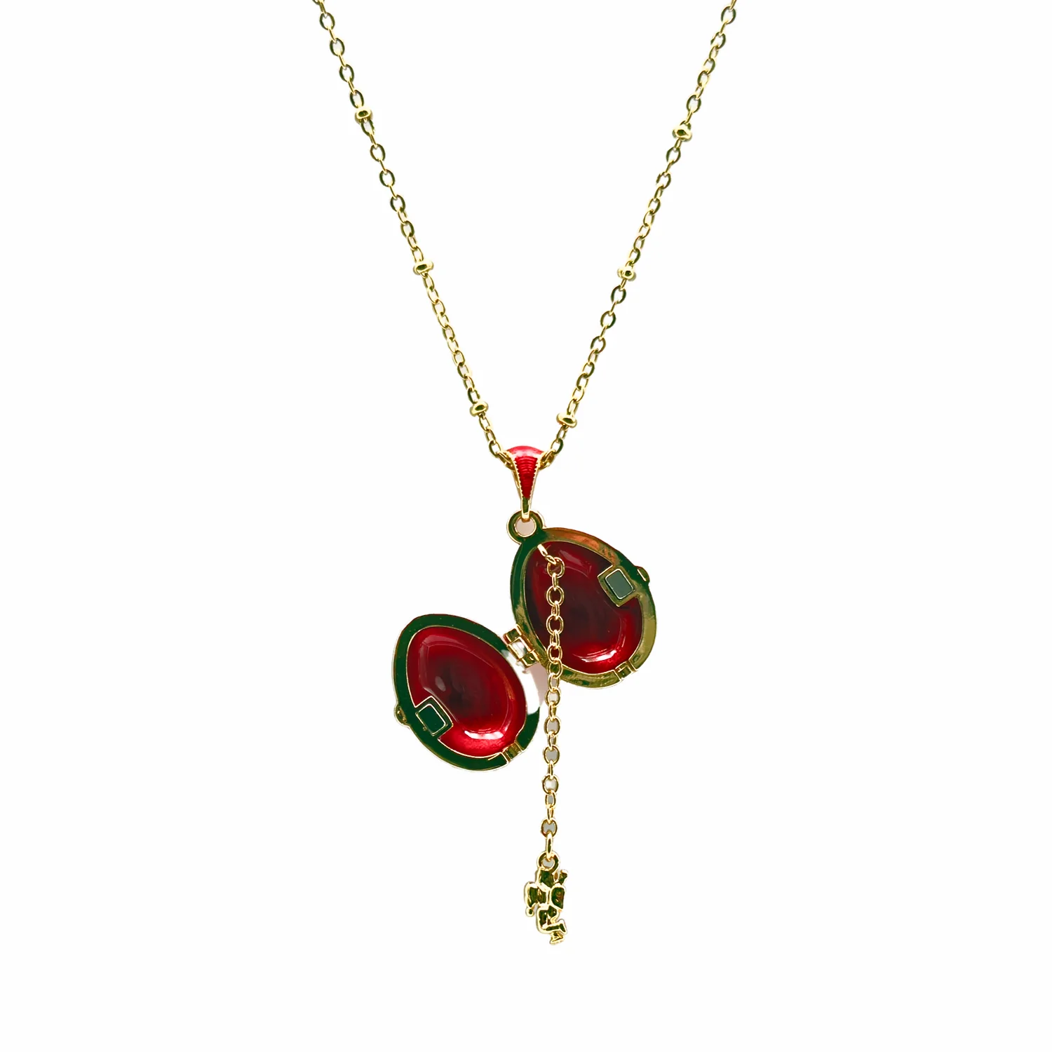 Mais la véritable magie de cette pièce réside dans son secret. En ouvrant délicatement la charnière de ce petit œuf de 2 cm, vous découvrez un intérieur émail rouge profond. Suspendu à une fine chaîne or miniature, un délicat petit Ange Gardien doré sculpté agenouillé glisse. Porter ce collier, c’est garder son ange protecteur et son amour pur tout contre son cœur, caché aux yeux du monde mais toujours présent.