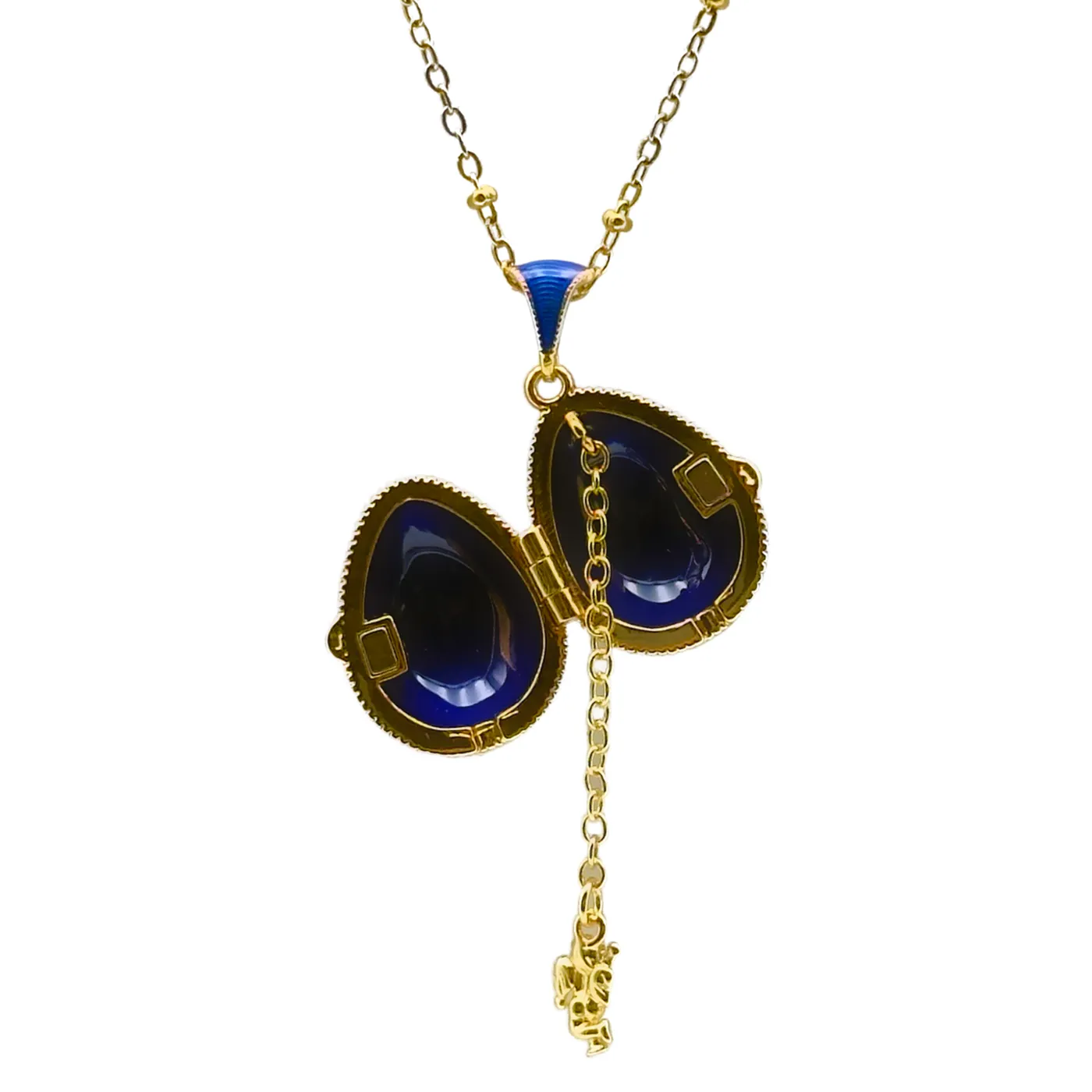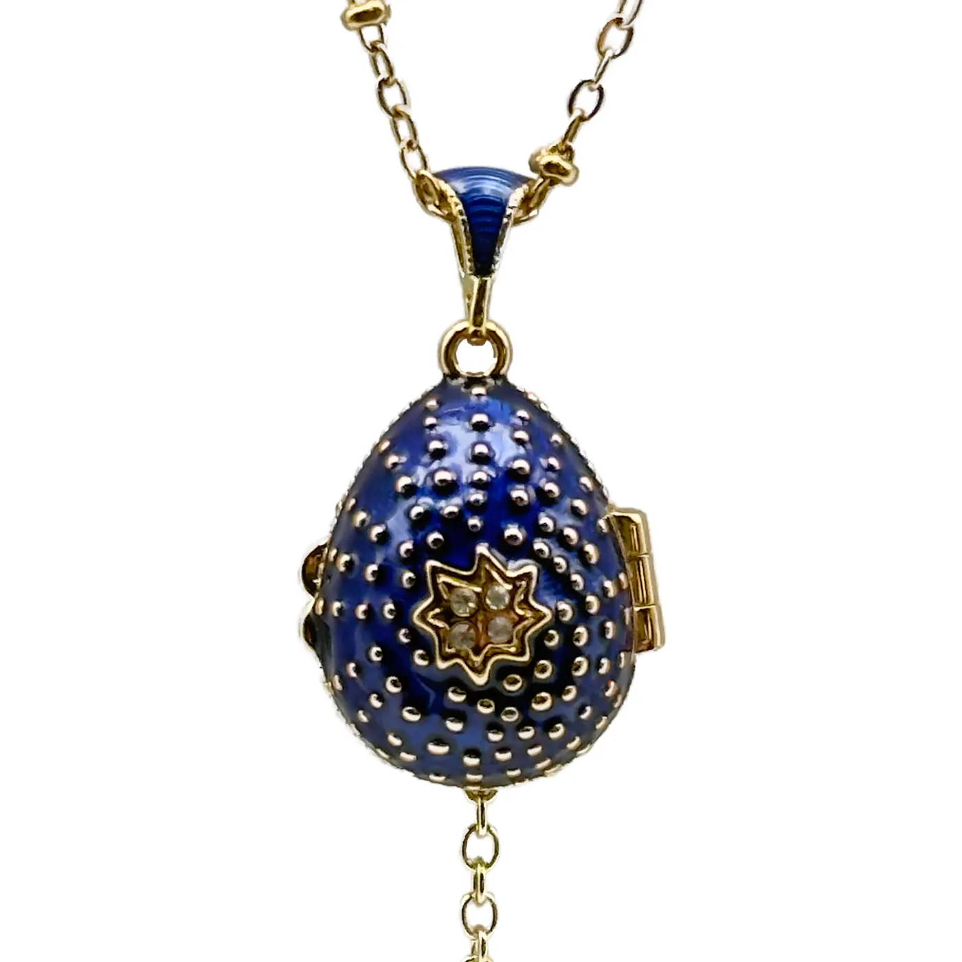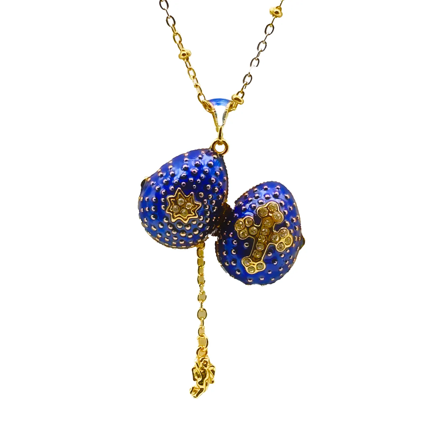 Ce magnifique collier capture l’essence de la dévotion et du raffinement avec son pendentif œuf bleu roi émaillé. Inspiré par les traditions impériales russes, il allie une esthétique classique à une symbolique profonde. Le bleu intense, rappelant le ciel et la royauté de la Vierge Marie, sert de fond à une croix magnifiquement ornée de cristaux. Chaque cristal capte la lumière, reflétant la pureté de la foi et l’espoir chrétien.
