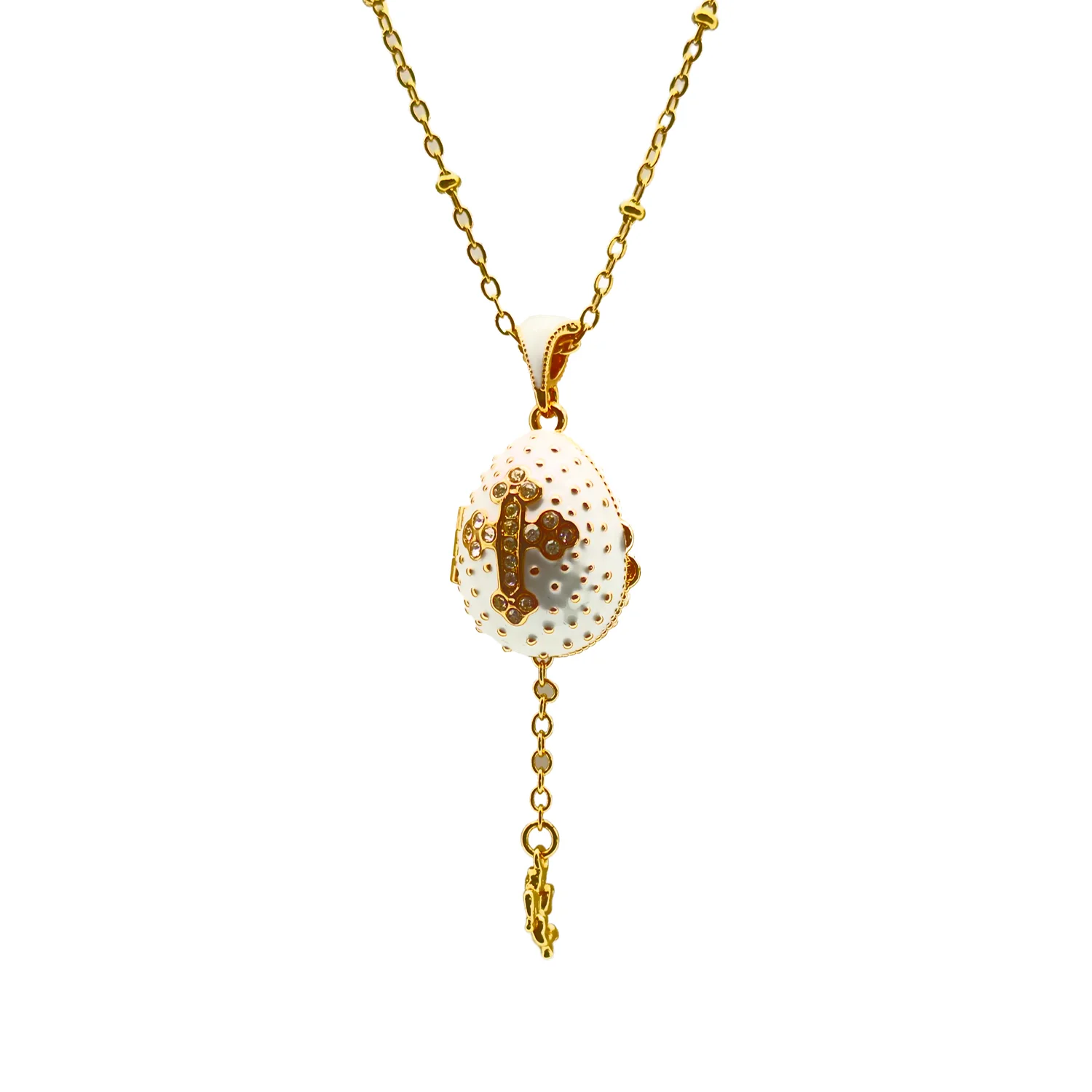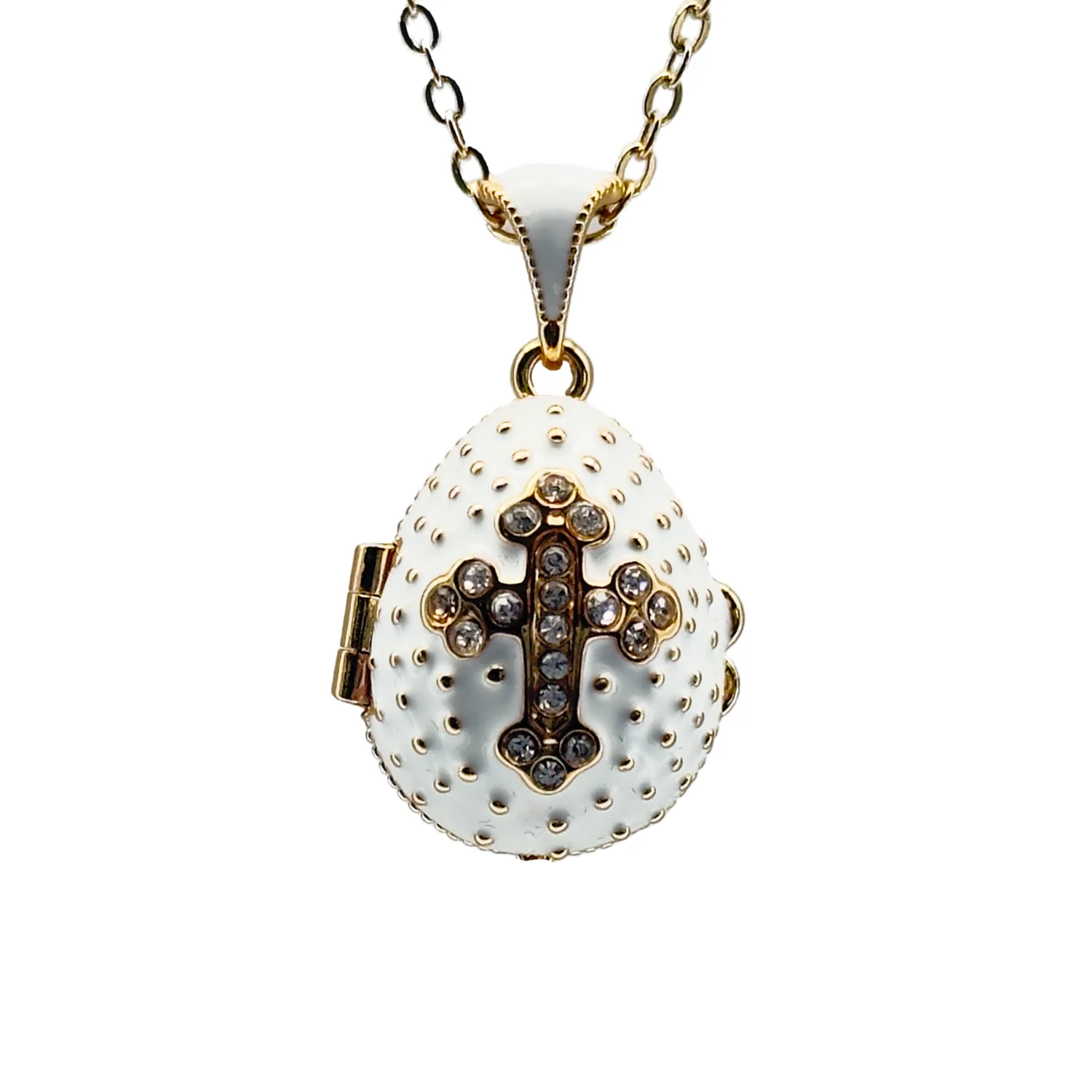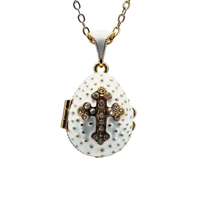 Ce magnifique collier capture l’essence de la dévotion et du raffinement avec son pendentif œuf blanc émaillé. Inspiré par les traditions impériales russes, il allie une esthétique classique à une symbolique profonde. Le bleu intense, rappelant le ciel et la royauté de la Vierge Marie, sert de fond à une croix magnifiquement ornée de cristaux. Chaque cristal capte la lumière, reflétant la pureté de la foi et l’espoir chrétien.