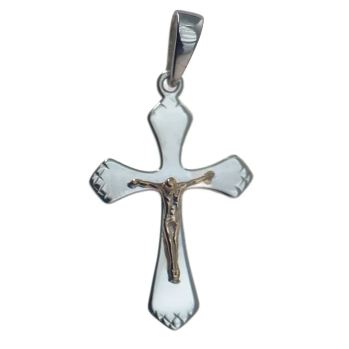 Façonnée en argent massif à la brillance miroir, elle porte en son centre un Christ en plaqué or, finement sculpté, symbole du sacrifice et de l’amour divin.