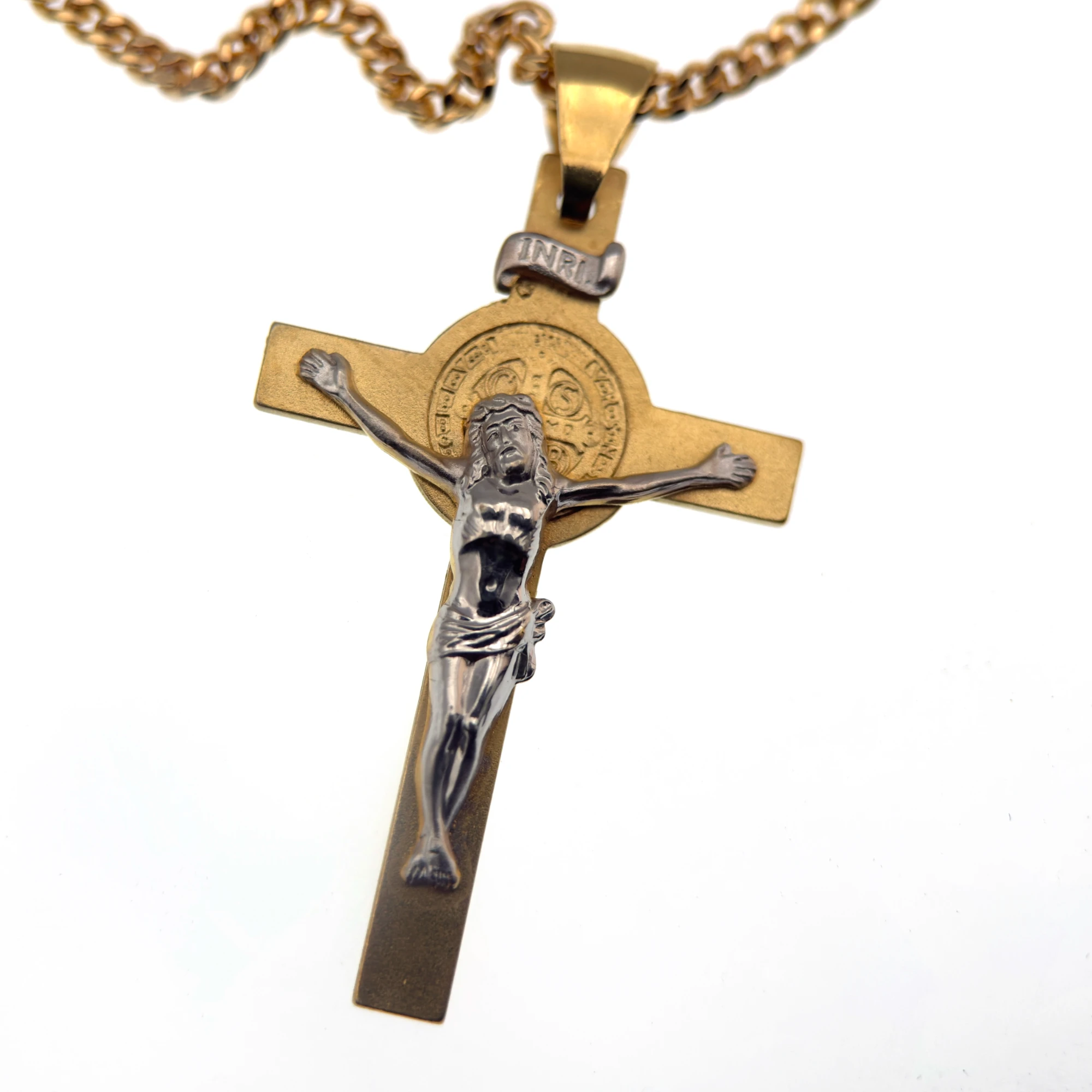 En plaqué or 18 carats, la croix est sublimée par un Christ argenté finement travaillé, offrant un contraste élégant et spirituel. Au centre se trouve la célèbre médaille de Saint Benoît, connue dans la tradition chrétienne pour sa valeur de protection contre le mal et son invocation de bénédictions.