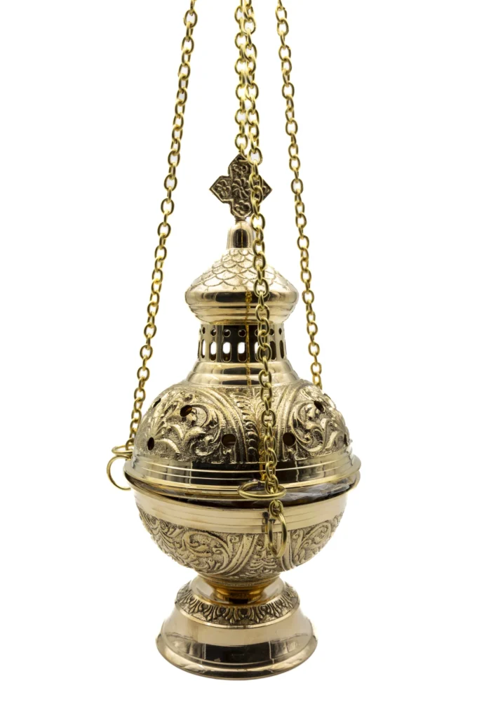 • Détails : Couvercle ajouré pour une diffusion régulière de la fumée; Décor végétal gravé et croix sommitale; Chaînes solides pour la manipulation pendant la prière.
