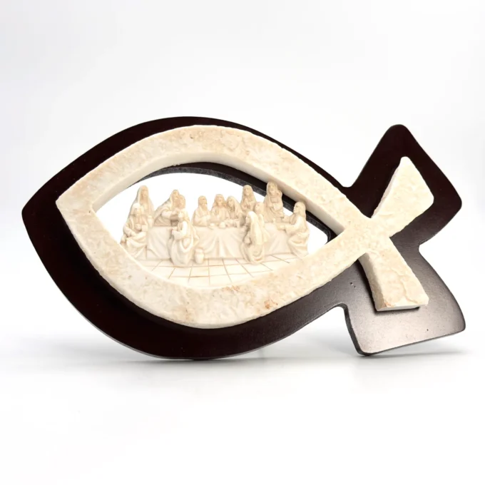 Cette création décorative unique est une véritable méditation visuelle. Elle rassemble dans un même écrin deux des symboles les plus puissants de la foi chrétienne : le Poisson Ichthus (l’ancien acronyme grec pour ‘Jésus Christ, Fils de Dieu, Sauveur’) et la fondation de l’Eucharistie : La Cène.