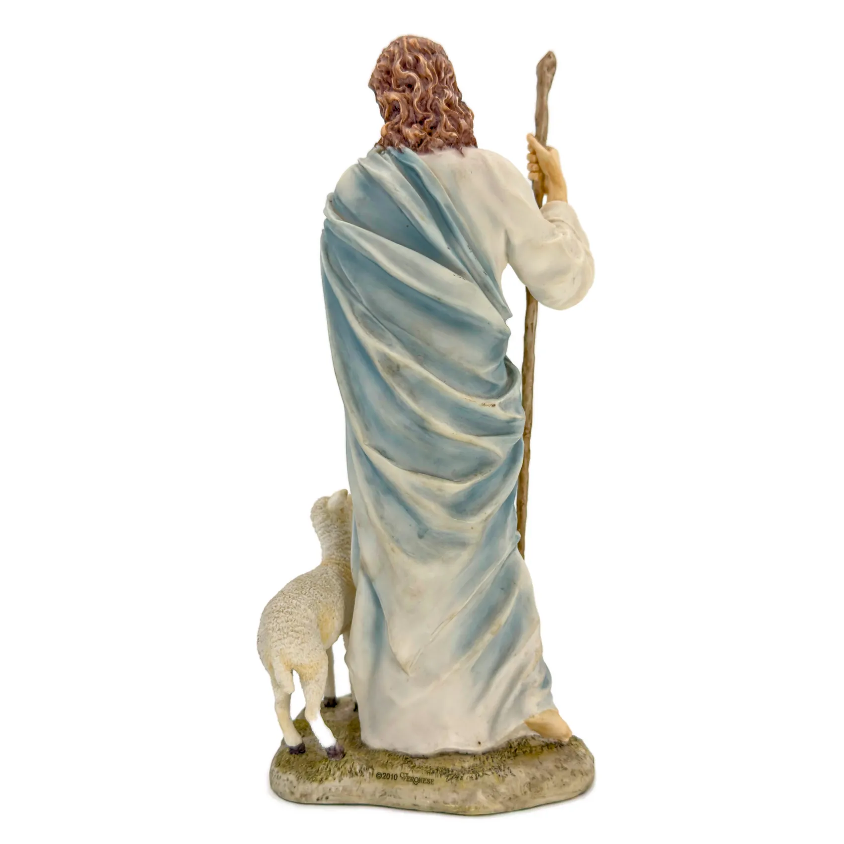 Cette statue représente le Christ sous les traits du Bon Pasteur, tenant un agneau dans ses bras et guidant son troupeau avec son bâton.