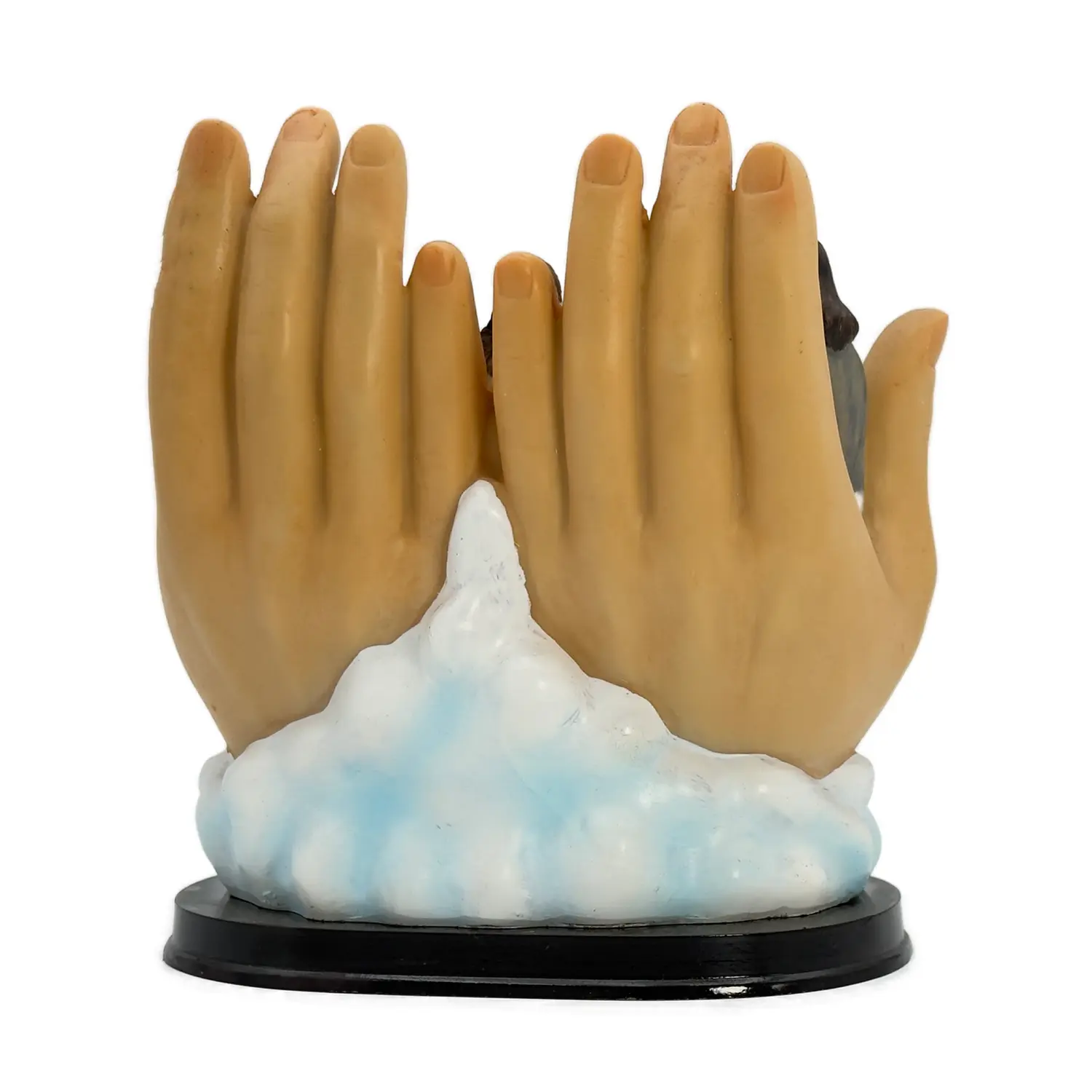 Mais ce qui rend cette statue particulièrement touchante, c’est la présence de deux grandes mains ouvertes, qui enveloppent et protègent la scène. Elles évoquent :