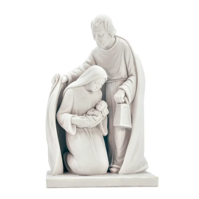 Cette statue représente la Sainte Famille dans une scène pleine de douceur et de recueillement. Marie, agenouillée, contemple l’Enfant Jésus qu’elle tient avec tendresse. Joseph, protecteur et attentif, veille sur eux, sa lanterne symbolisant la lumière guidant le foyer.