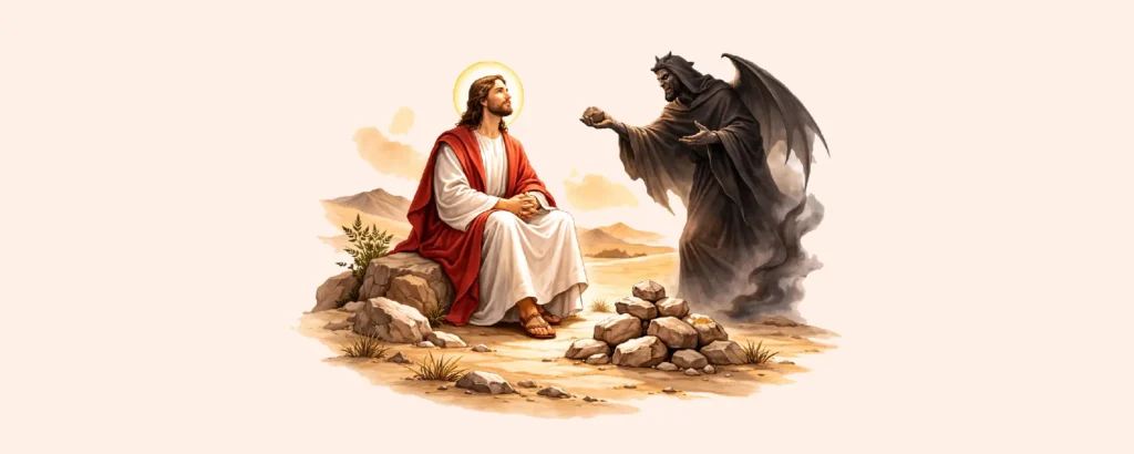 Après quarante jours de jeûne, Jésus a faim. Le tentateur lui propose d’utiliser sa puissance pour lui-même.